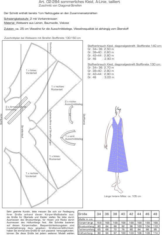 Stoffverbrauch Kleid, diagonalgestreift Stoffbreite 130 cm: